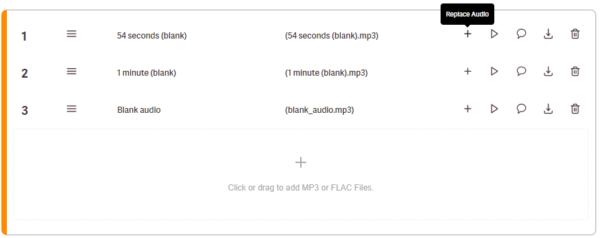 If you've accidentally uploaded the wrong audio file, or have a new version you want to replace an existing audio file with, you can easily replace audio files using the + icon.