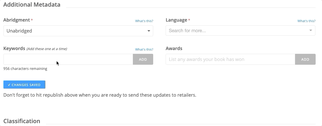 Keywords are a great way to add additional information for listeners to search for, as well as help retailers discover your title for merchandising opportunities.
